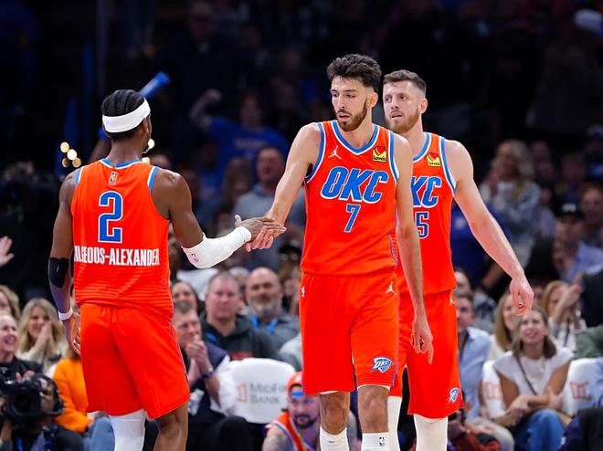 作为队内当家球星,亚历山大还在持续取得进步。赛季至今,亚历山大已经7次三节打卡,不过他仍然以423分领跑本赛季总得分榜。亚历山大本赛季场均轰下32.5分5.2板6.6助攻,场均得分高居联盟第2的同时,亚历山大场均命中11球,也排名联盟第2。需要关注的是,亚历山大场均得分、篮板、助攻、投篮命中率(52%)均与生涯新高基本持平。同时,亚历山大的罚球命中率(90.1%)创下生涯新高。作为双料MVP,亚历山大在上赛季的表现征服了对手与球迷。然而,亚历山大本赛季在攻防两端的表现更加稳健了。亚历山大已经有实力与尼古拉约基奇、扬尼斯阿德托昆博争夺联盟第1人的交椅了。