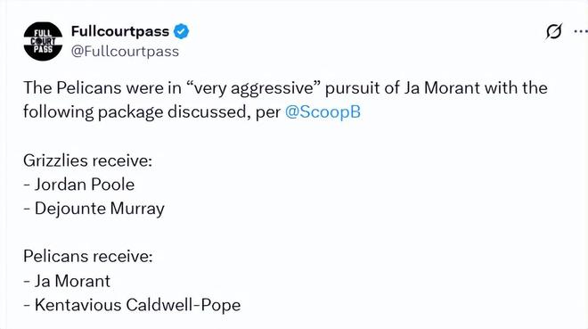 然而,鹈鹕队却寸步不让。新奥尔良方面不愿为任何一套交易方案附加选秀权,他们认为送出的球员筹码已经足以匹配莫兰特的身价。当灰熊队提出首轮签的硬性要求时,鹈鹕目前给出了 “拒绝” 的答复。