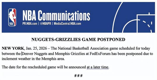 NBA官方在比赛开球前不到三小时发布公告称,鉴于孟菲斯地区的恶劣天气状况,本场比赛将择期重赛。该地区自当地时间周六清晨起便持续遭遇雨夹雪和冻雨天气,且降雪、冻雨交织的状况一直延续至周日上午。掘金与灰熊两队球员及本场执法裁判组均已抵达孟菲斯,但比赛最终还是延期举行。