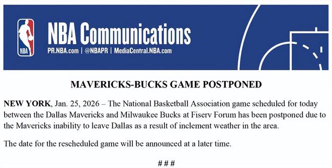 另外,根据原定赛程,密尔沃基雄鹿队将于北京时间今日上午8点主场迎战独行侠队,然而独行侠队于当地时间周六晚间未能顺利飞抵密尔沃基。目前,球队仍滞留达拉斯。NBA同样官方宣布,本场比赛因恶劣天气原因,比赛延期举行,补赛日期将另行公布。
