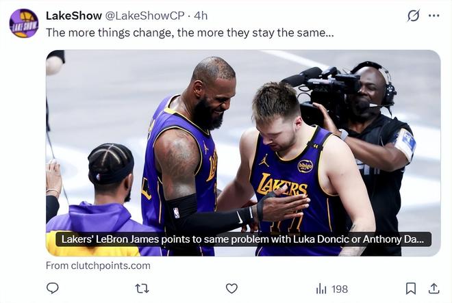 湖人媒体Laker Show发布了一篇文章,他写道:事物变化越多,却越是保持不变。这篇文中珍妮-巴斯透露目前湖人的重点是围绕东契奇建队而不是41岁的詹姆斯,虽然詹姆斯自2018年加盟湖人后一直是球队门面。(因为詹姆斯5260万的合同即将到期,湖人在今夏可以清理出很多薪金空间)