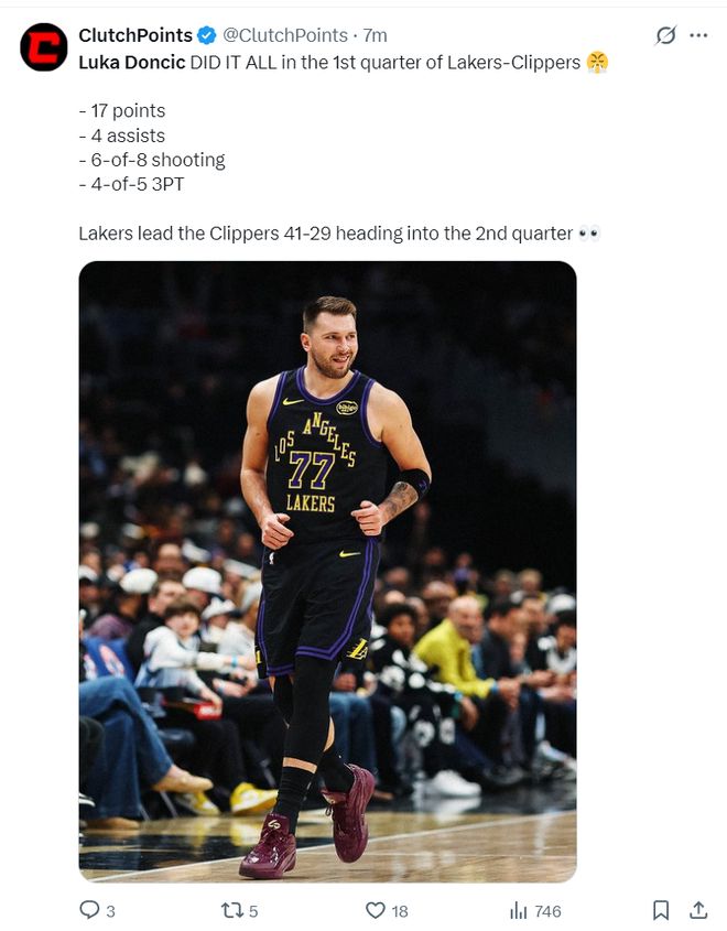 东契奇打快船是真的太猛了,4个三分球一个比一个难,一个比一个远,首节8中6,三分5中4,拿到17分4助攻2篮板,东契奇无愧联盟首节得分王。