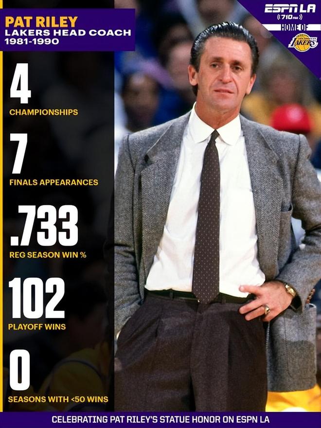 莱利在湖人的执教核心履历如下:1981–1990年担任湖人主教练,9年4冠,开创“Showtime”时代,常规赛533胜194负(胜率73.3%),季后赛102胜47负(胜率68.5%),9季均50+胜、5季60+胜,1989–90赛季获年度最佳教练。