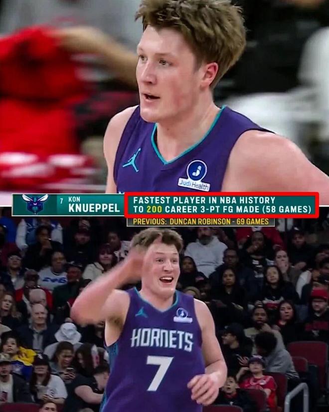 4、58场,克努佩尔仅仅用了58场比赛就投进了200记三分,历史最快,此前的前二快是邓肯罗宾逊69场、基根穆雷77场,作为对比,库里当年用了99场。