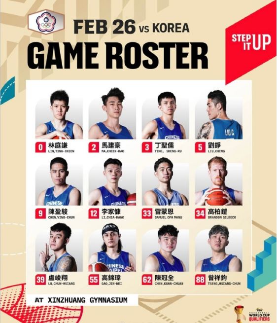 中国台北男篮对阵韩国男篮12人名单出炉: